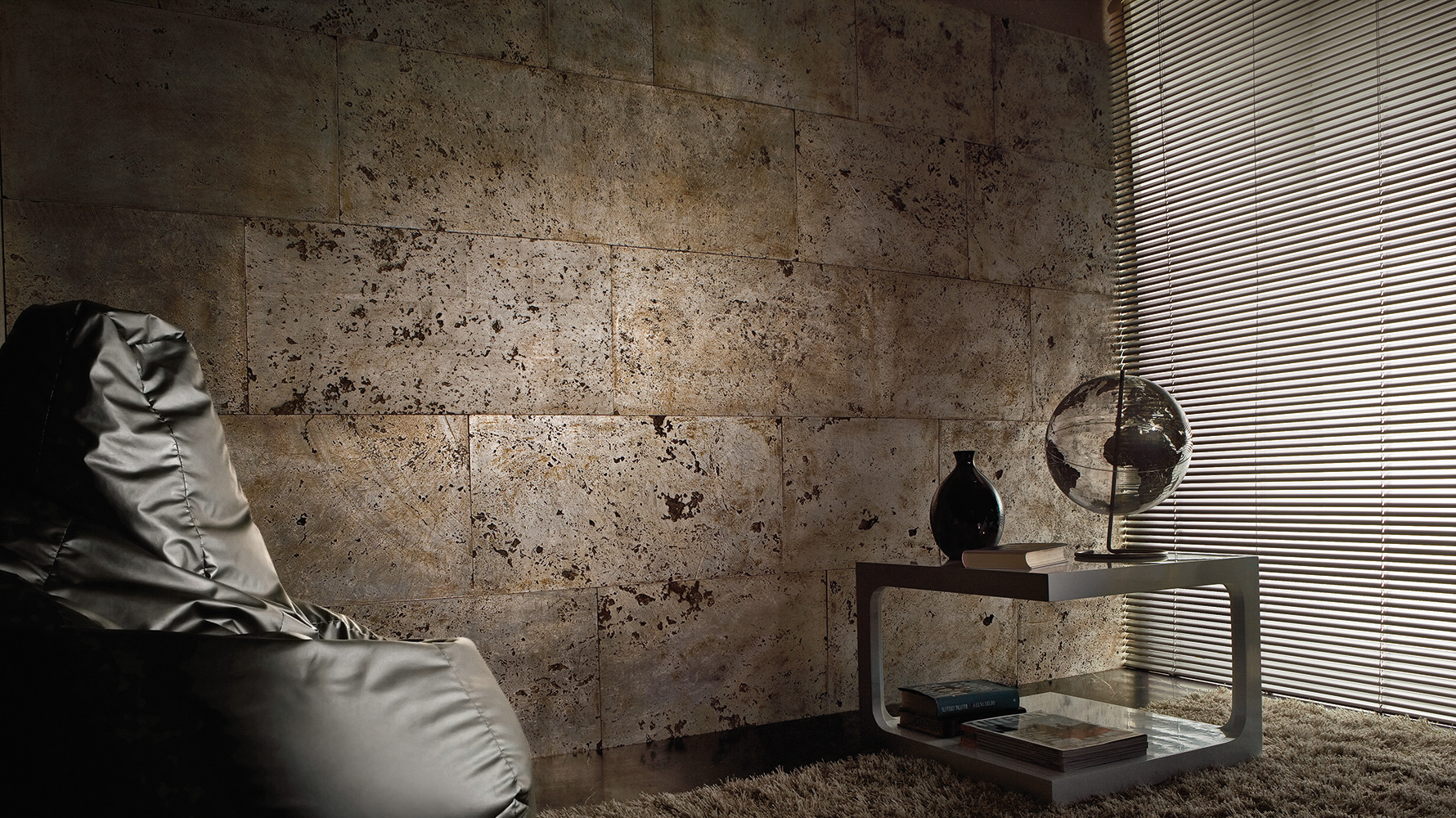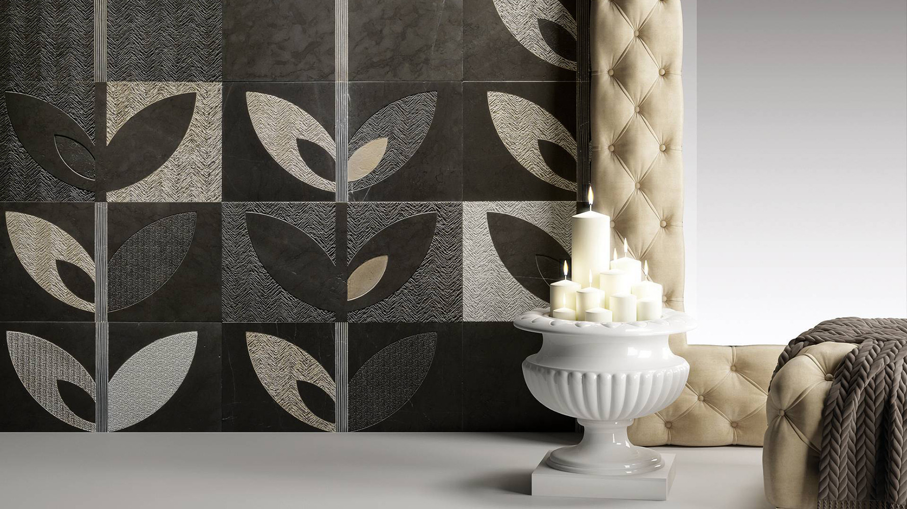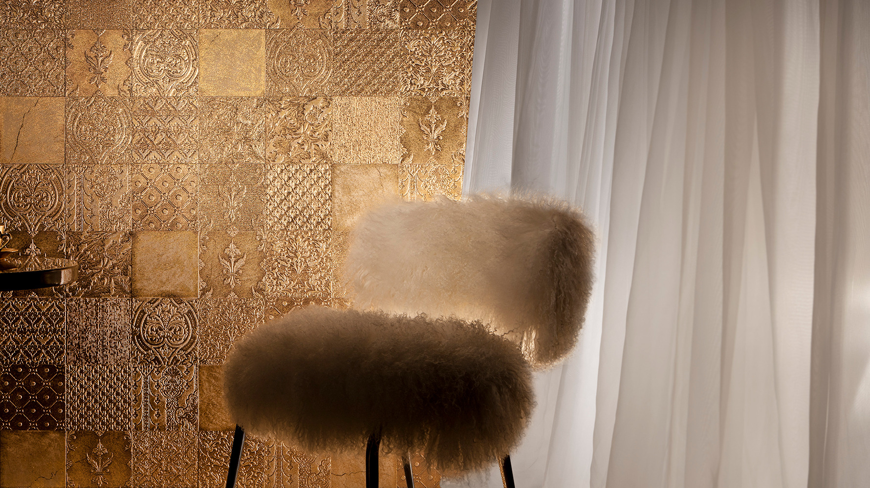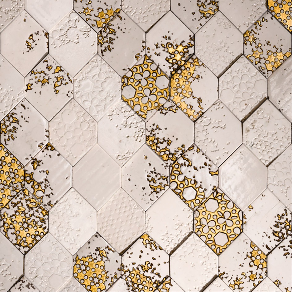 Inspired by the Renaissance etching technique of acquaforte, this collection of expertly and passionately decorated stones emerges at the intersection of different cultures and eras. Both ancient and contemporary, it embodies a sophisticated preciousness and a distinctive elegance, evident in every detail through unique customizations to create original compositions with a modern feel. In each of its variations, the precious gold and silver reflections and the other decorations of the Acqueforti collection elevate walls and floors, bestowing upon them a unique luminosity.
