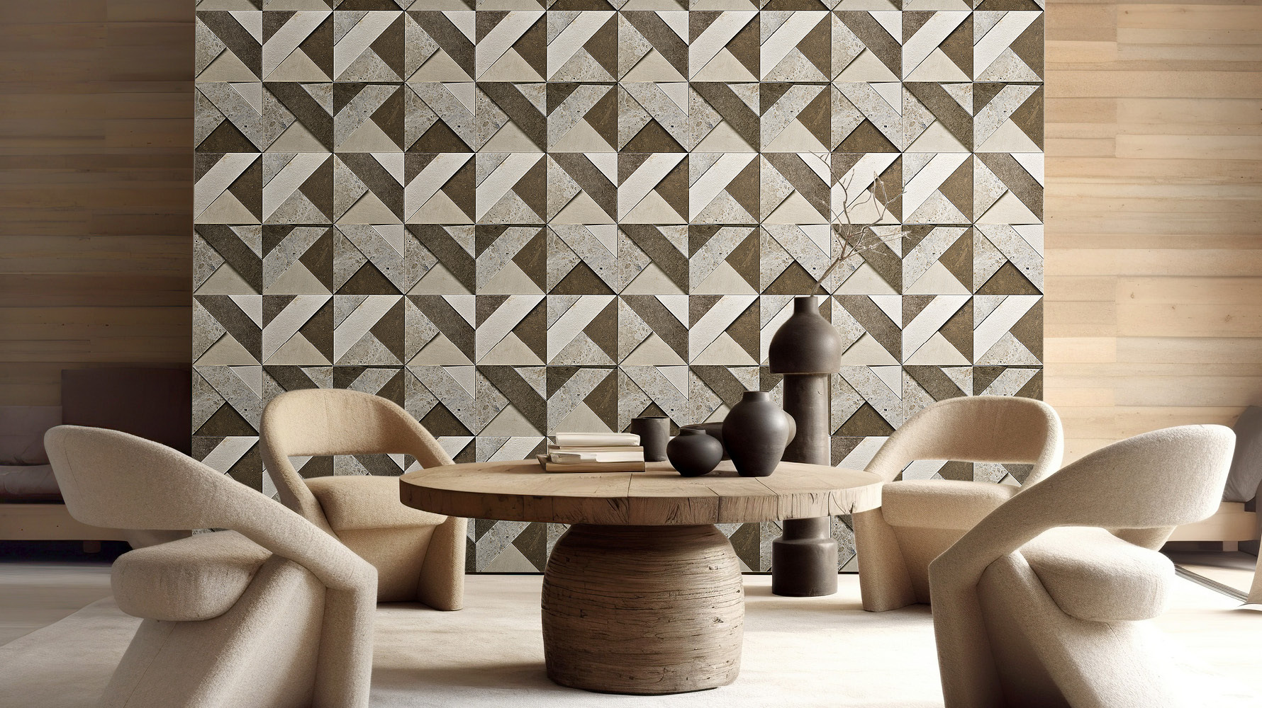 Inspired by the ancient Japanese art of paper folding, it features a refined pattern of interlocked stones and textures resulting in a powerful and energetic visual effect.