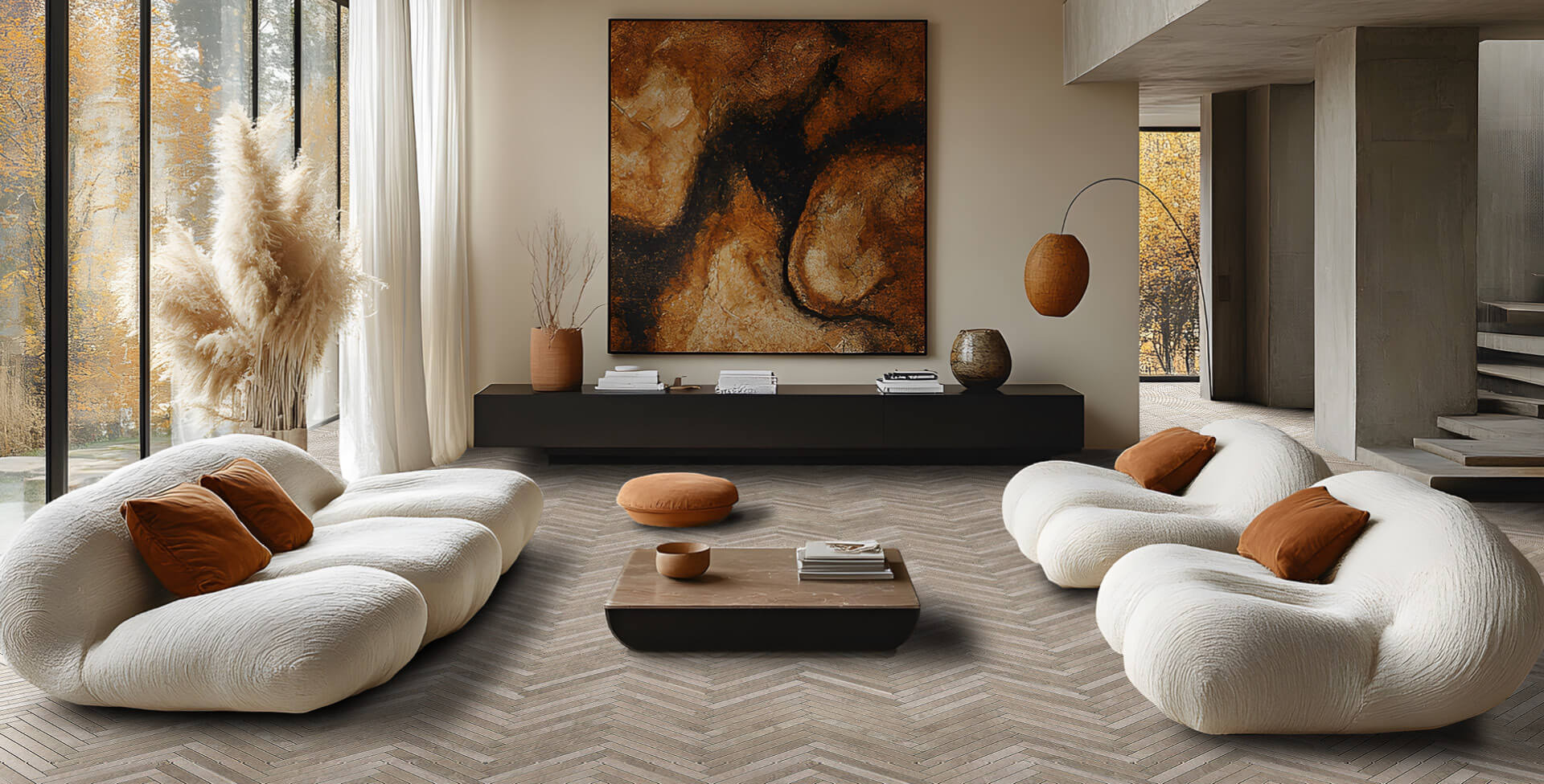 Il risultato è un insieme caldo e dinamico con applicazioni a parete e pavimento che si completano con eleganza e armonia.
