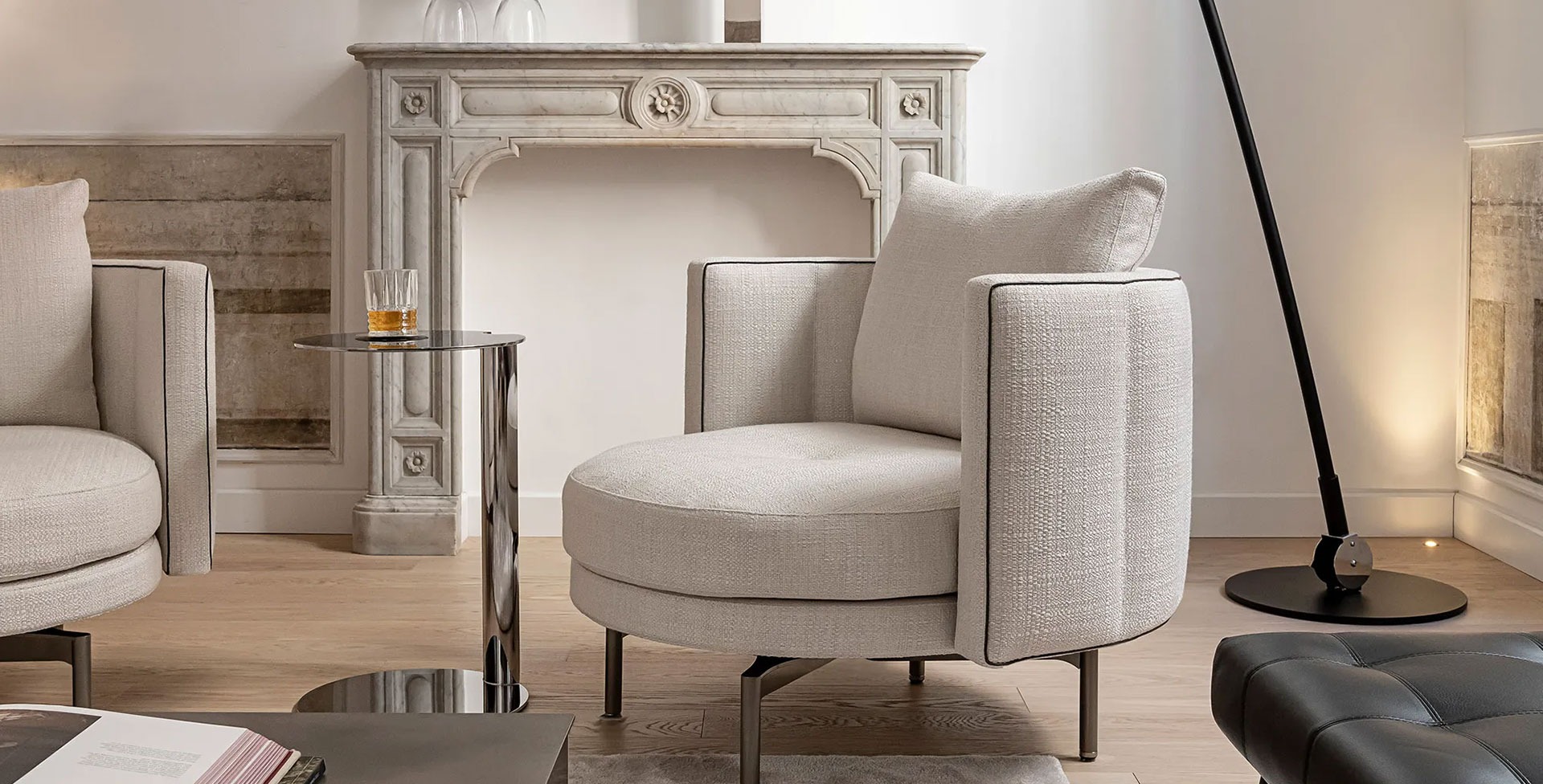 Fulcro dell’appartamento è l’area living, suddivisa da una bassa parete rivestita in marmo Antelope e impreziosita dal nostro esclusivo design Bjork. Da un lato, un raffinato salotto, dall’altro, un’accogliente media lounge, perfetta per momenti di quiete e relax.